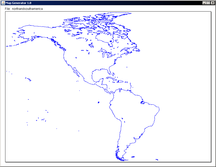 The program reads UNIX/Windows formatted text files (LF, CR/LF), in the format of the ones supplied above in the "WorldMap.tar". Input coordinates can be anything that a double precision floating point can be. Spaces delimit the coords, and negatives are welcome. The file coordinate space origin is interpreted to be in the lower left for (+,+) coordinates, this is the same as the traditional 2d coordinate space.